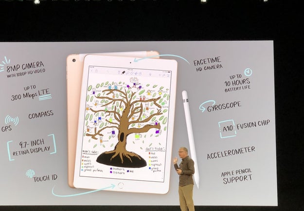 At 9.7 inches, the new iPad is the same size as the current entry-level iPad, which was also offered at a $329 price point. The new iPad Wi-Fi model with 32GB is $329, and the Wi-Fi and LTE version with 32GB costs $459. It shares most of the same technical specifications as that previous entry-level iPad model, with the addition of Apple Pencil support, as well as an A10 fusion processor, which Apple claims is more powerful than “virtually every Chromebook.” The iPad, however, does not have a Smart Connector, which allows for easy pairing to accessories like keyboards.